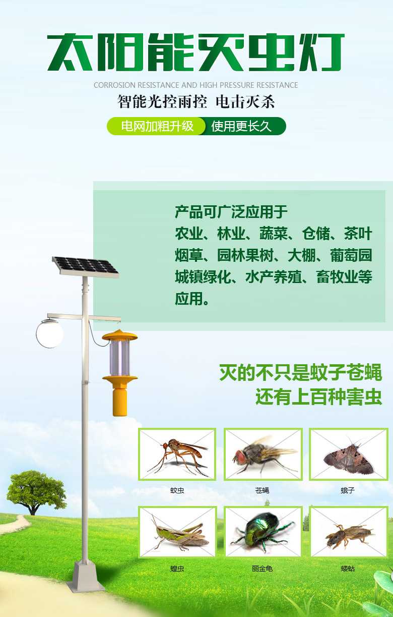 频振式太阳能杀虫照明一体灯具有光控、时控、雨控、过充、过放保护功能及微电脑自动保护系统。全天候,不怕水,耐高温,防腐蚀,移动方便。园林公园,别墅群,庭院,药材基地、蔬菜基地、茶园等场地使用。